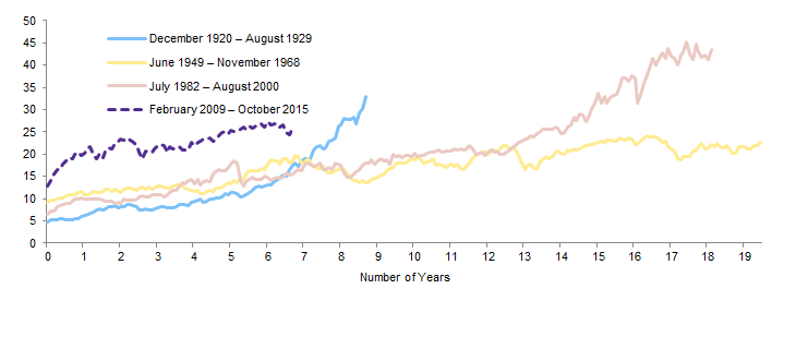 Since the February 2009 month-end, the S&P 500 has gained 152% in real cumulative terms through October 2015, a period of approximately 6.7 years. Comparatively, the prior three secular bull markets lasted over 15 years and generated a 513% real cumulative return, on average (Figure 6). If this is indeed a new secular bull, this look at past secular bulls suggests the US market may only be in the early- to mid-stages of such a cycle.