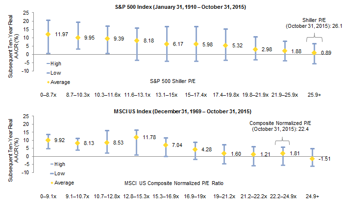 For those skeptical of assessing current market valuations relative to those from a century ago or longer and of relying too heavily on the Shiller methodology, our preferred composite normalized P/E metric using monthly data for the MSCI US Index stood at 22.4 as of October 31, 2015. This ranks in the 82nd percentile of monthly observations since December 31, 1969, a period over which the composition of the economy and stock market are arguably more similar. While this shorter time period magnifies the positive skew of the extreme late 1990s tech-bubble valuations, the data tell a very similar story as the longer Shiller P/E time series for the S&P 500. When valuations of the MSCI US have previously been at levels similar to today’s starting point, the index has subsequently returned a ten-year real annualized gain of just 1%–2% on average.
