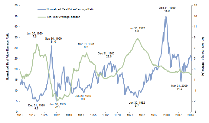 Notes: Graph represents quarterly data. Earnings are as of September 30, 2015, and are preliminary. Normalized real price-earnings ratios for the S&P 500 Index are calculated by dividing the current index value by the trailing ten-year average of real earnings.
