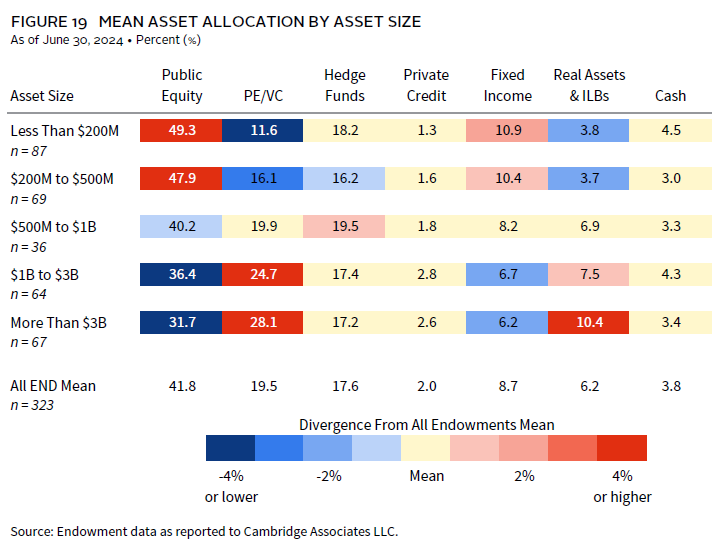 At most endowments, the majority of the long-term portfolio is invested in public equity and PE/VC. On average for the overall endowment universe, about 61% of the long-term investment portfolio (LTIP) was allocated across these categories at the end of fiscal year 2024. The combined average allocation does not vary much across different asset sizes, ranging from a high of 64% for the $200 million to $500 million cohort to a low of 60% for a couple other subgroups. However, the breakdown of allocations between public and private equities does look quite different when going up or down the portfolio size spectrum (Figure 19).