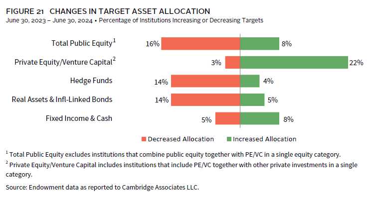 While the precise details are difficult to ascertain through our survey data, information we collect on target asset allocations can be insightful in understanding where endowments might be modifying their policies going forward. Despite the slight decrease in actual PE/VC allocations over the past two years, a significant number of endowments continue to raise their targets in this category (Figure 21). Over the past year, 22% of respondents increased their target to PE/VC, while only a small proportion (3%) reported a decrease. In contrast, for public equity and hedge funds—where actual allocations have recently ticked up slightly—more endowments reported decreases to their targets in 2024 than increases. These data suggest that the recent changes in average asset allocations are mostly attributable to market dynamics and the natural effects those have on portfolio holdings.