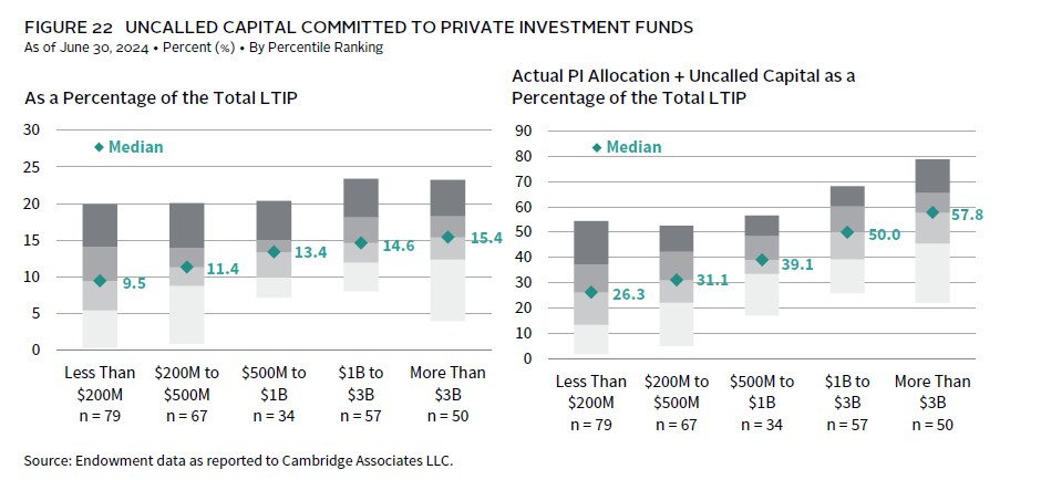 The dollar amount of unfunded commitments can be equivalent to as much as 25% or more of the portfolio’s current asset size at some endowments. On the other hand, at some smaller endowments, these commitments can be relatively small compared to the size of the investment portfolio. For endowments with assets greater than $3 billion, the median ratio of uncalled capital–to-LTIP market value was 15% at the end of fiscal year 2024. The median ratio was lowest (9%) at endowments with assets less than $200 million. When considering a measure that combines unfunded commitments with actual private allocations, these ratios were generally much higher at larger endowments than their smaller peers.