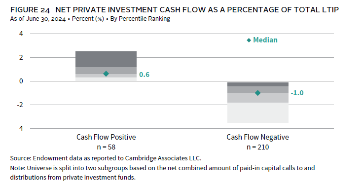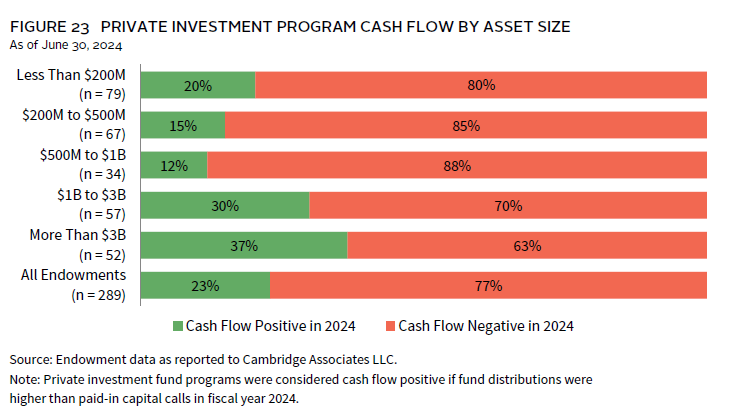 Distributions from existing private investment funds can serve as a source of funding for new capital calls. However, when these distributions fall short, institutions must find additional liquidity to meet new capital calls. This was a common experience among endowments in fiscal year 2024. More than three-quarters (77%) of respondents reported that their private investment programs were cash flow negative, meaning the amount of distributions from private funds was insufficient to cover the new capital paid in (Figure 23). The experience was similar across both larger and smaller endowments, with the majority of respondents in each asset size cohort reporting the same outcome.