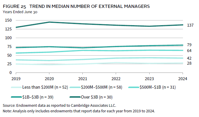 Some interesting trends emerged from a constant group of endowments that provided manager data going back to 2019 (Figure 25). For each asset size cohort, the median number of managers in 2024 was higher than the median from five years ago. However, the trend has not steadily increased across time. For endowments greater than $3 billion, the median in 2024 remained below the peak number reported in 2020. Similarly, the median for endowments with assets less than $200 million was slightly lower compared to 2022. Looking back over the past year for all endowments in this analysis, exactly half of endowments reported more managers in 2024 compared to 2023.
