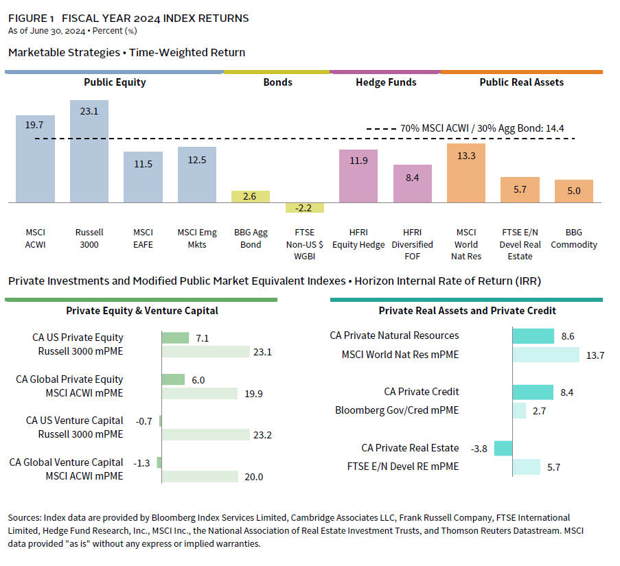 In recent years, the performance gap between private equity and public equity has fluctuated significantly. The return environment in 2024 mirrored the previous fiscal year, with the global public equity market outperforming alternative asset classes and strategies (Figure 6). The CA Private Equity and Venture Capital Index has underperformed the mPME version of the MSCI ACWI by more than 1,500 bps in each of the last two years. These have been by far the largest margins of underperformance for the private benchmark over the last 25 years. The performance story was the opposite in fiscal years 2021 and 2022, when extraordinary outperformance by private investments was the key theme.