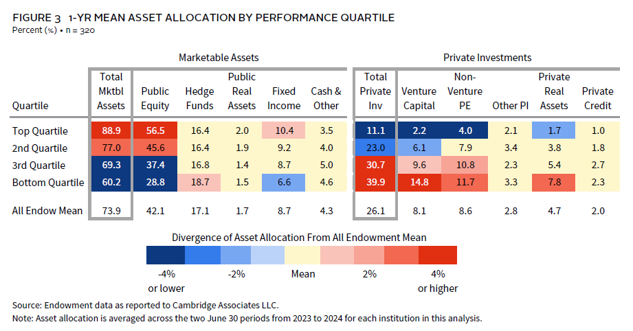 In Figure 3, our heat map analysis illustrates the effect of different asset allocation structures on returns for the overall peer universe. Top quartile performers in 2024 had 56% of their portfolios invested in public equities, nearly double the exposure of the bottom quartile of performers. The opposite was true when it came to private investment allocations. The average private investment allocation for top performers (11%) was roughly one-fourth of what the average was for the bottom quartile (40%).