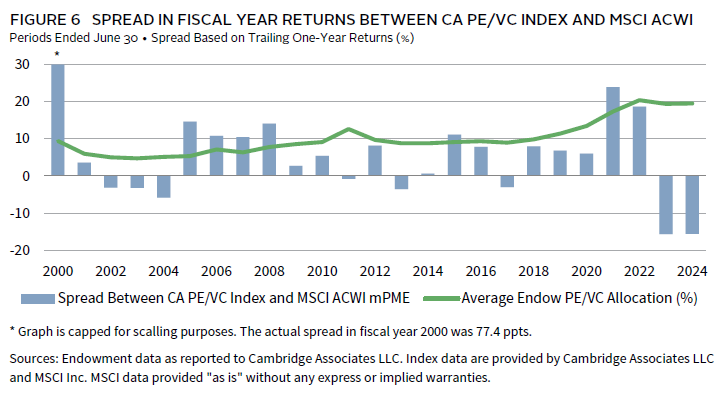 The divergence in private equity and public equity performance has occurred during a period where private investment allocations among endowments have reached an all-time high. Consequently, the spread between diversified portfolios and the simple 70/30 benchmark has also reached historically high levels (Figure 7). The endowment median return was 360 bps lower than the benchmark in 2024, which was just slightly better from a comparative standpoint than the outcome of the year before. Conversely, in 2021 and 2022, endowments’ outperformance of the simple benchmark was among the largest margins recorded over this past generation.