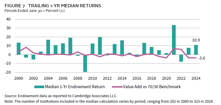 In this market environment, endowments that had diversified into alternative assets struggled to match the performance of the simple 70/30 portfolio (Figure 2). Most institutions in the CA endowment universe maintain high allocations to alternative assets, with the private investment portion representing more than one-quarter of the entire portfolio for the average endowment. The substantial allocations to private investments across most of this universe—and the weaker performance from these strategies in 2024—are the main reason that that median fiscal year peer return underperformed the simple benchmark by more than 300 basis points (bps). In fact, less than 10% (28 of 323) of endowments in this study outperformed the mark in 2024.