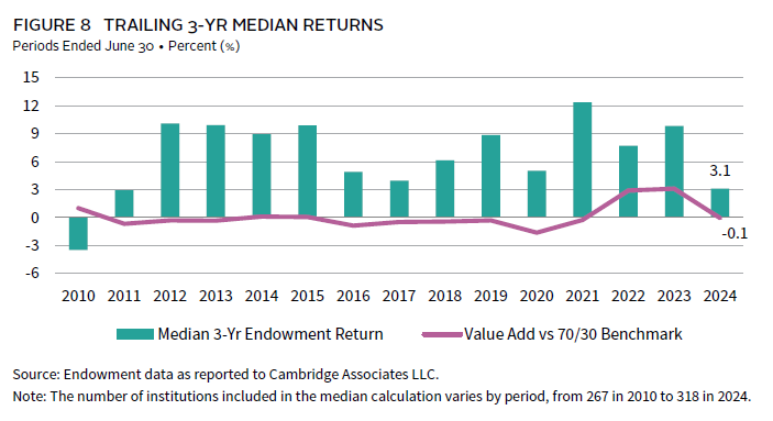 The banner year of 2021 left a lasting impact on endowments’ multiyear performance track records both in absolute terms and relative to the simple benchmark. However, the 2021 results dropped out of the calculation for the most recent three-year period and this statistic has slumped dramatically compared to recent history. The median three-year endowment return of 3.1% as of June 30, 2024, was the lowest reported since the early 2010s, when trailing returns were still being weighed down by the depths of the Global Financial Crisis.