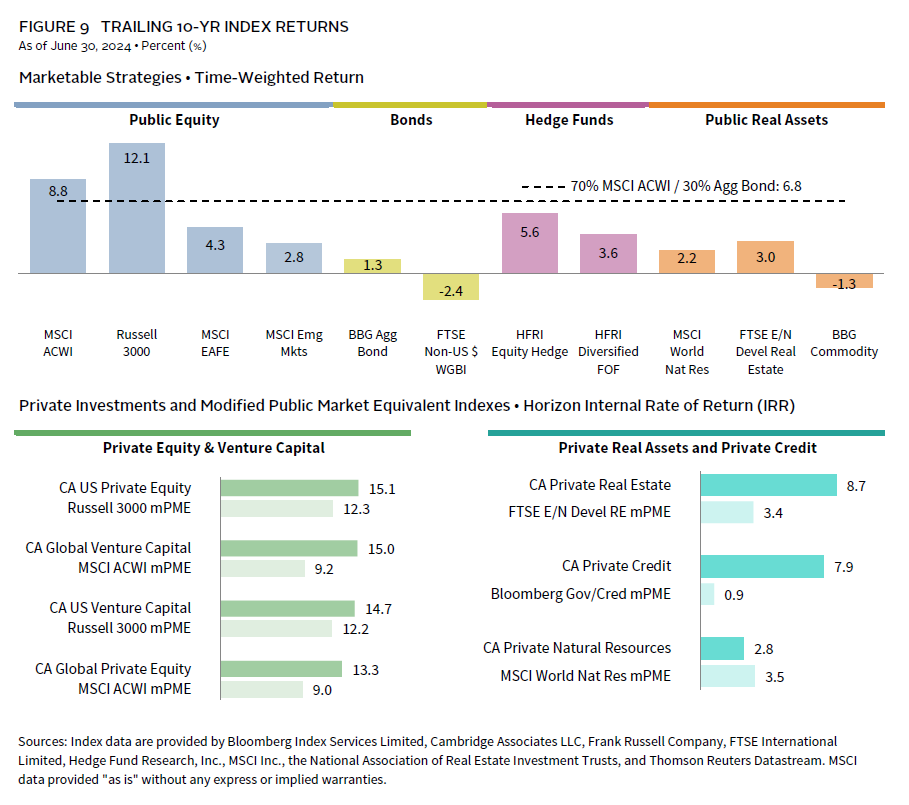 Elsewhere, the inflation spike from a couple years ago provided a short-term boon to inflation-hedging strategies. However, most of the past decade was not a conducive environment for strong returns from natural resources–related investments and commodities. In real estate, the CA Private Real Estate Index produced an annualized IRR just shy of 9% for the decade, but public markets were muted.