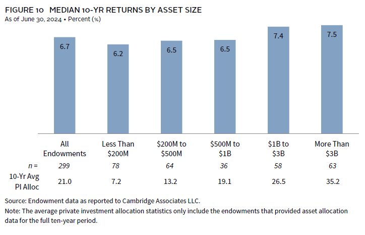 Asset allocation helps explain the return differentials across the asset size cohorts. Endowments with the best returns over the past decade had the highest allocations to the best-performing strategies across this period, namely private investments. When considering the average private investments allocation across the full ten-year period, these assets accounted for more than one-third of the average portfolio for the endowments greater than $3 billion, which was a key reason that most large endowments were able to outperform the passive portfolio option of the 70/30 benchmark. Private allocations were smaller when stepping down the asset size scale; the average for endowments less than $200 million was just 7%.