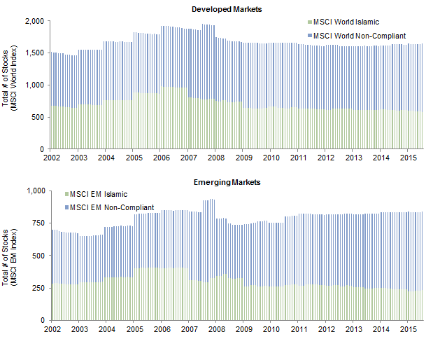 Each index provider has a Shariah board with slightly different rules for compliance. This can cause differences in the size of universe, with Islamic indices ranging from just one-third to over half the size of their respective mainstream counterparts. Figure 3 shows the ratio of Shariah-compliant to non-Shariah-compliant stocks over time for the MSCI World and MSCI Emerging Markets indices. Since inception of the MSCI Islamic indices in May 2002, the MSCI World Islamic and MSCI EM Islamic indices have had average monthly inclusion rates of 42% and 38%, respectively.[1]The MSCI World and EM Islamic indices were launched on Jul 26, 2007. Data prior to the launch date is back-tested data (i.e. calculations of how the index might have performed over that time period … Continue reading