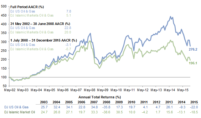 Shariah compliance for these funds can be achieved in the same way as for broad-market equity funds (described earlier). Shariah indices exist, such as the Dow Jones Islamic Market Oil & Gas Index, which screens companies based on similar characteristics as those previously described for equity funds.[6]According to S&P Dow Jones Indices LLC: Companies must meet Shariah requirements for acceptable products, business activities, debt levels, and interest income and expenses. The screening … Continue reading Figure 10 compares the returns of the Dow Jones Oil & Gas Index against its Shariah-compliant counterpart.