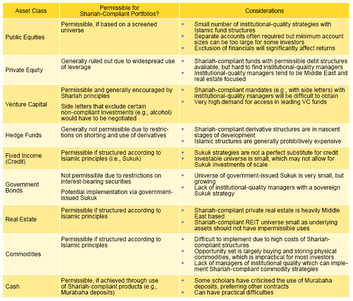 - Institutional investors look at a wide variety of asset classes when considering how to build a portfolio that meets their risk and return objectives, including equities, bonds, real assets, hedge funds, and private equity. A portfolio aligned with Shariah principles will need to make investments using specific transaction types created to facilitate Shariah-compliant investing.
