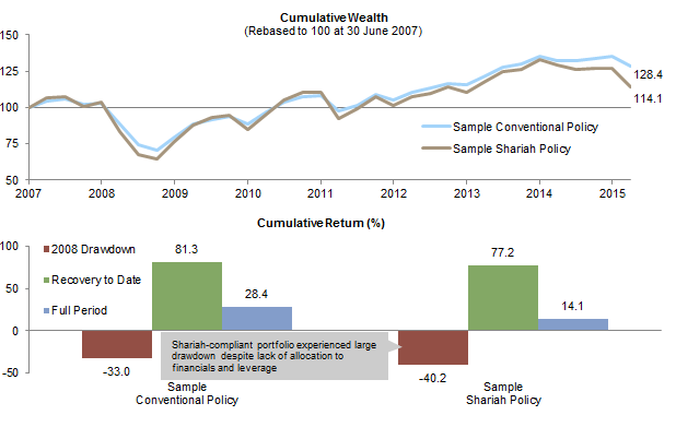 Notes: The Conventional Policy is based on the average asset allocation as at 30 September 2015 of 84 institutions with assets greater than $1 billion in the Cambridge Associates peer database. Relevant benchmarks were used to proxy returns over time for this asset allocation. The Sample Shariah Policy uses relevant benchmarks to proxy a return for an asset allocation of 70% developed markets equities, 20% emerging markets equities, 5% global Sukuk, and 5% Murabaha (cash). All data are quarterly and based on total returns. Total returns for MSCI developed markets indices are net of dividend taxes. Total returns for MSCI all country and emerging markets indices are gross of dividend taxes. Periods are represented by the following: ‘2008 Drawdown’, third quarter 2008 through third quarter 2009; ‘Recovery to Date’, second quarter 2009 through third quarter 2015; and ‘Full Period’, second quarter 2007 through third quarter 2015.