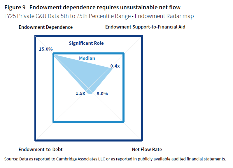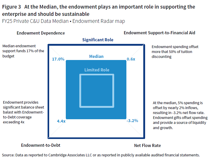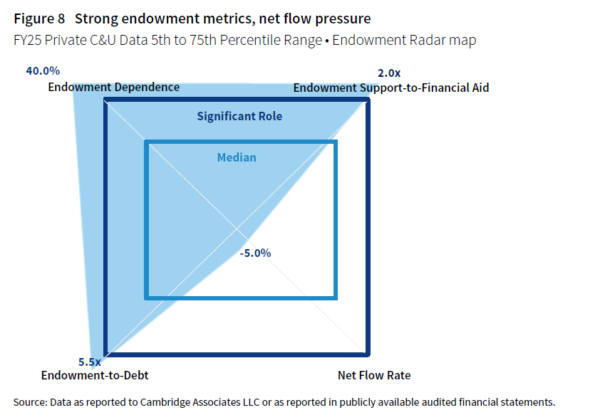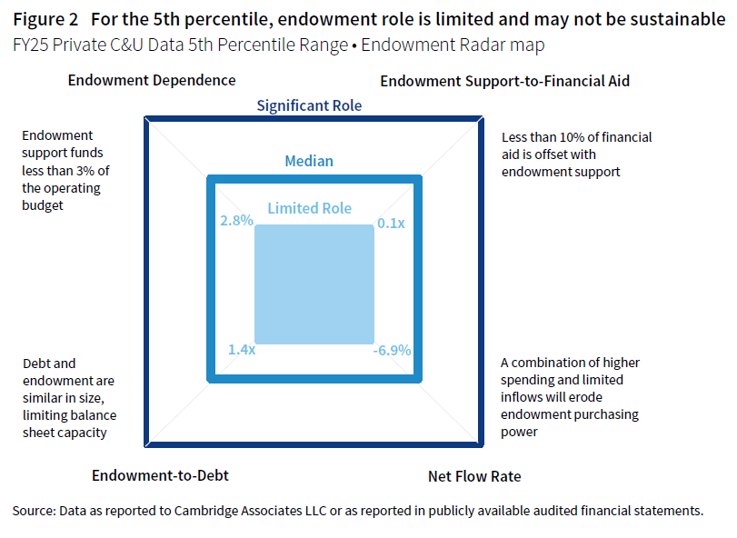 There is a very different story at the inner edge of the Endowment Radar map. At the 5th percentile, institutions have limited endowment support and net flow is stressed, compromising the endowment’s future role (Figure 2). Endowment spending supports less than 3% of the operating budget and replaces less than 10% of financial aid and scholarships. The endowment market value only slightly exceeds long-term debt at a ratio of 1.4x, limiting balance sheet capacity to absorb strategic initiatives. The -6.9% net flow rate reflects unsustainable spending levels and limited fundraising, which threaten long-term endowment purchasing power.