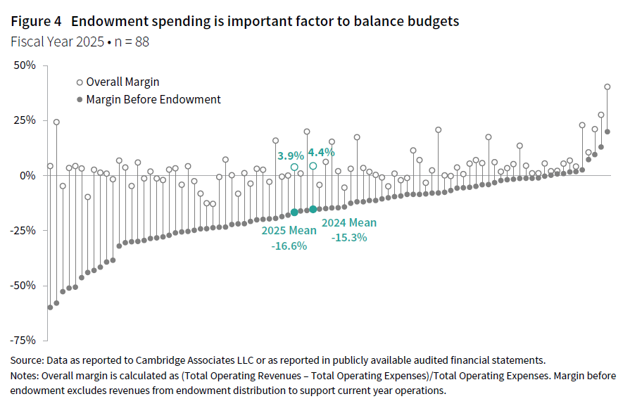 - The average margin before endowment fell from -15.3% in 2024 to -16.6% in 2025, suggesting the higher education business model is increasingly reliant on endowment spending to buffer operations.