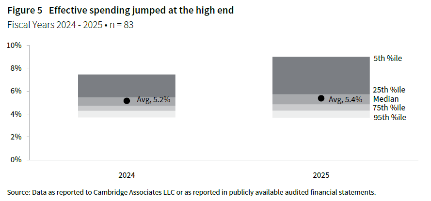Some institutions relied on higher spending from the endowment to respond to operating challenges (Figure 5). Spending pressures became more pronounced at the highest spending quartile, where effective rates ranged from 5.7% to 9.0%. Spending at the 5th percentile jumped from 7.4% last year to nearly double digits this year. The upward shift in spending suggests continued operating headwinds, placing increased pressure on endowment assets as a source of liquidity and budgetary support.