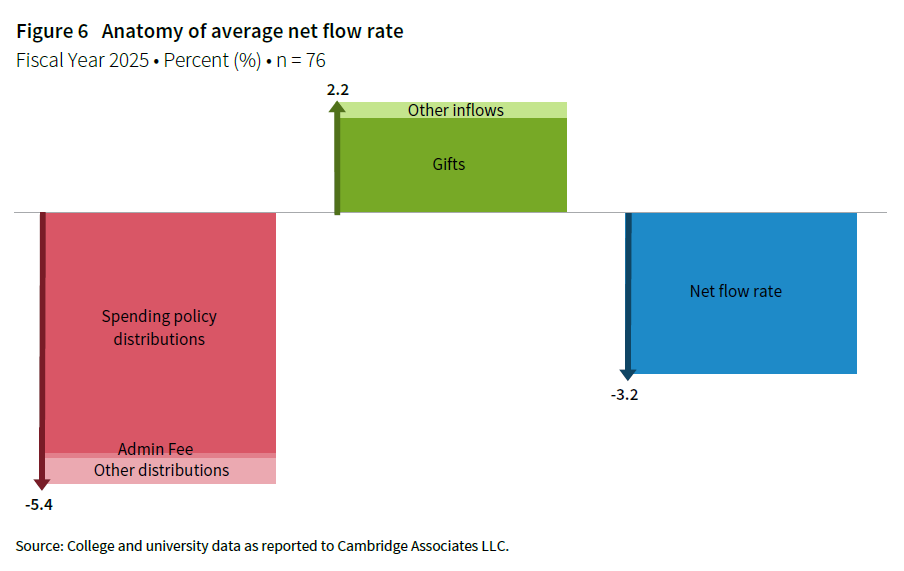 Spending directly impacts the purchasing power of existing endowment funds. Over time, high spending can erode this purchasing power if withdrawals outpace investment returns, while disciplined spending can help preserve and grow the endowment. However, spending is only part of the equation. The net flow rate (Figure 6) is an important component of the Endowment Radar because it captures the combined effect of both outflows (i.e., spending) and inflows (i.e., new gifts or contributions). By considering net flow, we gain a more complete picture of the endowment’s future role and sustainability. Positive inflows strengthen the endowment’s purchasing power and expand its capacity to support institutional priorities, making net flow a key indicator of the long-term role of the endowment.