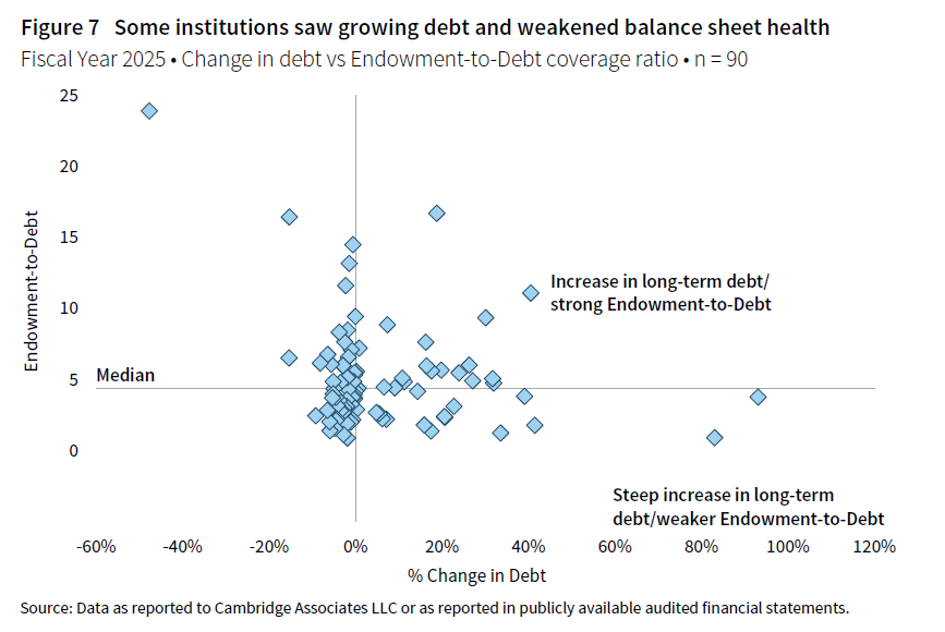 The endowment-to-debt ratio is an indicator of balance sheet strength and borrowing capacity. The ratio can inform discussions about the strategic use of debt in the near term and long term, as well as the role of the endowment required to support financing plans. Many institutions increased their long-term debt obligations in 2025 (Figure 7). Some borrowed more and continued to maintain a healthy endowment-to-debt ratio, whereas increased borrowing by others resulted in a less healthy ratio.