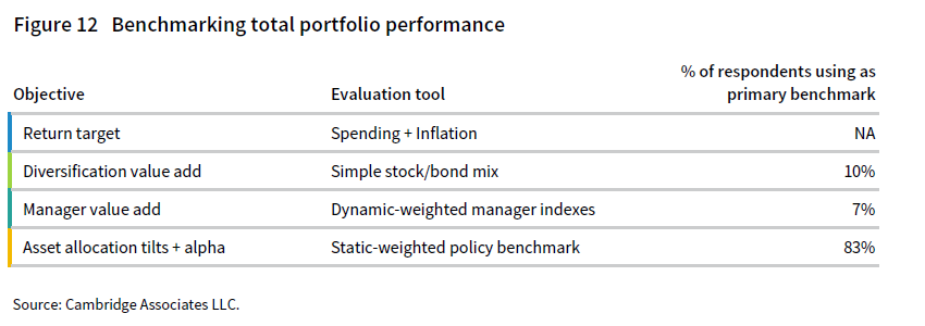 Benchmarking investment performance is an essential piece of an endowment’s well-functioning governance process. When selecting a benchmark, it is important for institutions to understand what types of questions they are seeking to answer (Figure 12). There is no single benchmark that can assess every single aspect of portfolio management. Consequently, it is not uncommon for institutions to use multiple benchmarks in their performance evaluation process. In our survey, we asked respondents to provide both the real return objective for the endowment and the primary benchmark used to evaluate investment performance at the total portfolio level.