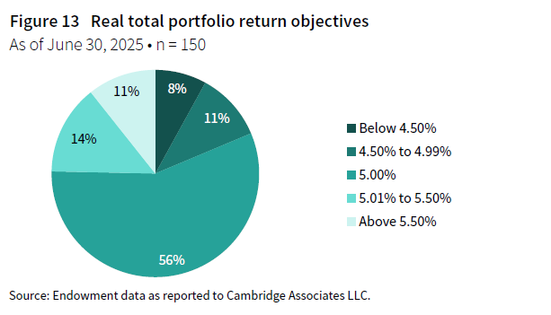 A fundamental part of an endowment’s investment policy is the return objective. Most endowments use a spending policy that is connected in some way to an annual spending rate. That percentage rate serves as the basis for establishing a minimum return target that endowments aim to earn over the long term. If an endowment can generate an investment return that exceeds the sum of its spending rate and inflation, it can maintain or grow the purchasing power of its assets over time. The most common real (i.e., inflation-adjusted) return objective among endowments continues to be 5% (Figure 13).