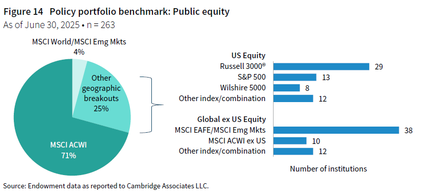 The MSCI ACWI continues to be the most common benchmark for public equities. In fiscal year 2025, 71% of the respondent group used this index to represent their entire public equity allocation in the policy portfolio benchmark (Figure 14). This was up slightly from the 69% of institutions that cited the index in last year’s study. The remaining respondents use a combination of indexes that are more geographically defined. For those that use a US-focused benchmark, the Russell 3000® Index was by far the most prevalent. For global ex US equities, a combination of the MSCI EAFE Index and the MSCI Emerging Markets Index was cited most often.