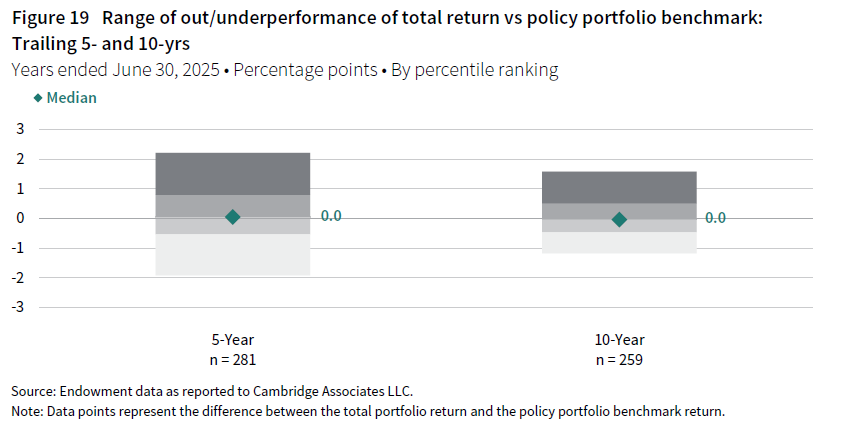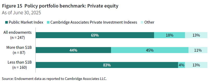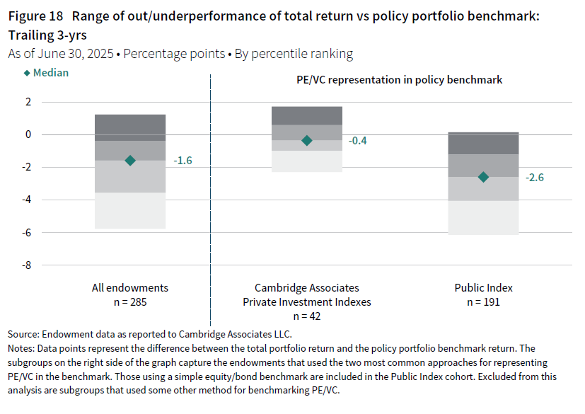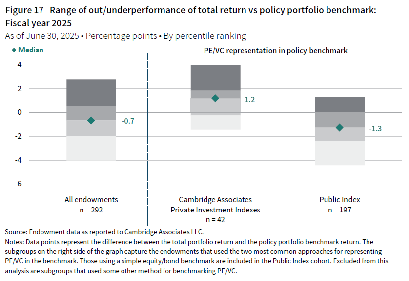 The different experiences of these two subgroups tie back to the relationship between public equity and private equity index returns in 2025. The one-year horizon IRR of the CA Private Equity and Venture Capital Index was considerably lower than the mPME version of the MSCI ACWI (10% versus 16%). Therefore, an endowment using a public market index would calculate a higher benchmark return than it would if using a private equity–specific index. With most endowments in the peer universe having 20% or more of their portfolios invested in PE/VC, the index choice is quite consequential in the policy benchmark calculation.