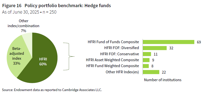 Endowments also face similar challenges of selecting an appropriate index when accounting for hedge fund allocations in the policy benchmark. Most respondents continued to use one or more indexes produced by Hedge Fund Research® (HFR), which tracks hedge fund managers that report to their database (Figure 16). Within this family of indexes, the HFRI Fund of Funds Composite was most often cited. Other approaches included a beta-adjusted benchmark, although the exact method varied across a few different options. Most respondents using this type of benchmark used either a blended public equity/bond index or a blended public equity/91-Day T-Bill return stream. In both instances, the MSCI ACWI with a 0.3 beta was the most common approach.