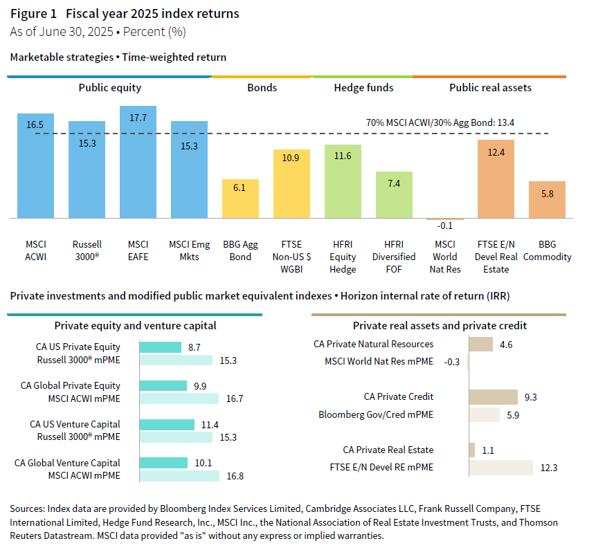 Fiscal year 2025 was marked by strong performance across most major asset classes. Once again, public equities delivered robust returns, with the MSCI ACWI rising 16.5% for the year. The returns of the geographic-based public equity indexes in Figure 1 all fell within a relatively narrow range that was well into the double digits. This broad-based equity rally reflected resilient corporate earnings, moderating inflation in the United States and Eurozone, and policy easing among several of the major central banks.