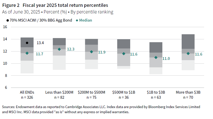 Most endowments reported total portfolio returns in the double digits in fiscal year 2025, with the median landing at 11.7% (Figure 2). This was the highest median return reported for the endowment universe since 2021. The dispersion in returns among endowments was much lower than what we have seen in recent years. The spread between the 5th and 95th percentile of performers was just 590 basis points (bps), which was the third lowest we have calculated in the over four decades of compiling endowment data. There was little variation when breaking the universe up into different asset size cohorts. The median return for all asset size subgroups in Figure 2 was within 70 bps of the median for the overall universe.