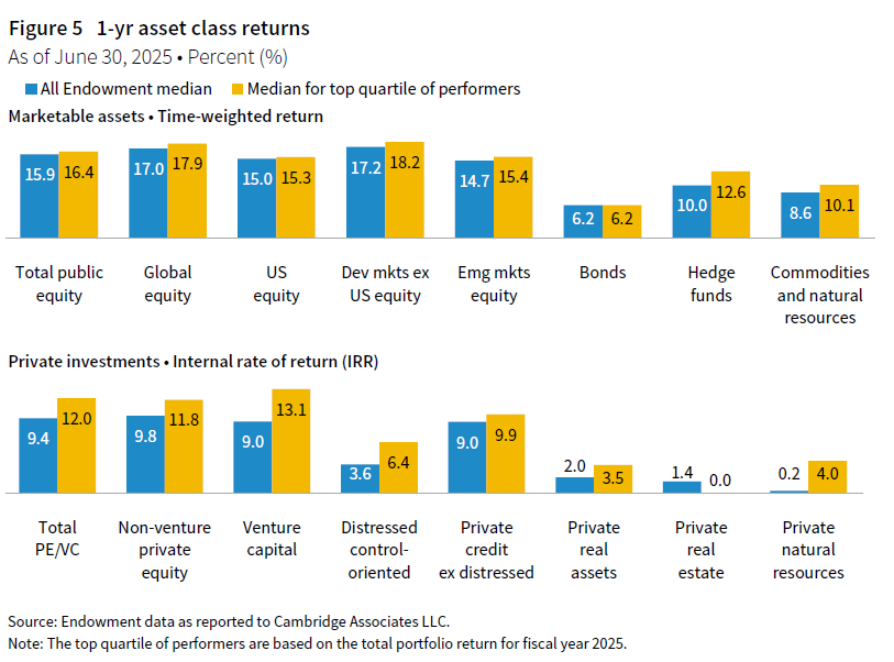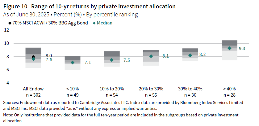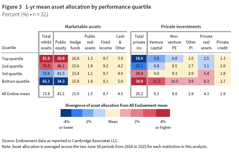 It is also important to note that the allocations presented in these tables are averages and can mask the variation in asset allocation structures that exist even among institutions that earn similar returns. For example, there were stark differences in asset allocations among the endowments that earned the best performance over the past year. Nearly half of the top 20 endowments as ranked by fiscal year return were among the highest allocators to private investments in the peer universe. This suggests that other factors beyond asset allocation played a meaningful role in the comparative performance story of 2025.