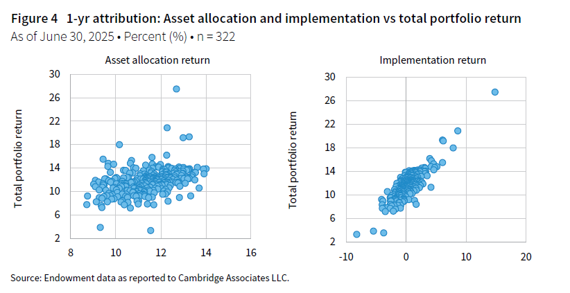 Our attribution model estimates how much of each institution’s return can be explained by its asset allocation. Plotting the estimated asset allocation returns against the total portfolio returns for the endowment universe confirms that the relationship between the two was not particularly strong for the fiscal year (Figure 4). On the other hand, the portion of return that came from implementing the portfolio was a key driver of relative peer performance according to our analysis. This is a departure from the trend of the last few years where asset allocation was the more impactful factor for understanding the dispersion in peer returns.