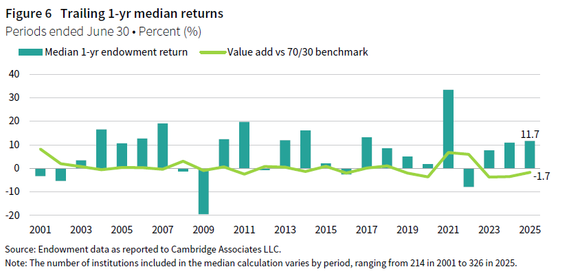 While many of the alternative asset classes delivered solid returns for the fiscal year, they did not quite match up to the simple 70/30 option. Consequently, the endowment median underperformed the simple benchmark by 170 bps in 2025 (Figure 6). This was actually a considerable improvement over the previous two fiscal years when the median’s underperformance were 350 bps and 370 bps, respectively. In fact, the spread between the peer group median and the simple benchmark this past year was the smallest it has been since 2018. The first half of the 2020s has seen volatile swings in both directions in terms of the relative out/underperformance of the median versus the 70/30 benchmark.