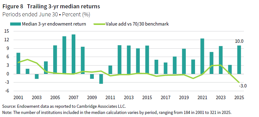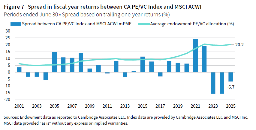 The dynamic between public and private equity market returns is usually the most important aspect to understand, as the bulk of endowment portfolios tend to be allocated across these strategies. The differential between the CA PE/VC Index and the MSCI ACWI mPME was as small in 2025 as it has been in several years (Figure 7). While this contributed to the narrowing of the spread between the peer median and the simple benchmark, the degree of underperformance for the median was still quite meaningful. This is because more than 20% of the average endowment portfolio is now invested in PE/VC—twice the allocation seen for most of the previous decade. As a result, even more moderate differentials between public equity and private equity market returns can significantly impact the median return’s value add against the simple benchmark.