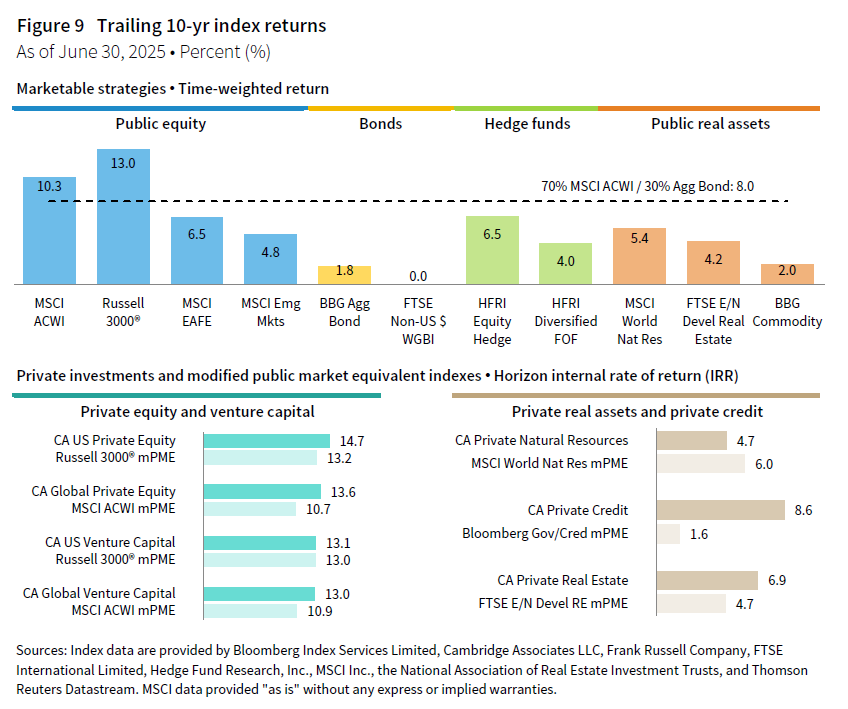 For bonds, the past decade was one of the lower trailing ten-year performance periods on record. The index tracking US investment-grade bonds returned less than 2%, and the index tracking sovereign bonds outside of the United States was flat. Private debt provided much more opportunity for enhanced returns as the CA Private Credit Index produced an internal rate of return (IRR) that was greater than 8%. Results were mixed when it came to real assets strategies, with private real estate outperforming its mPME counterpart and private natural resources strategies underperforming.