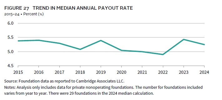 The median payout rate for participating foundations was 5.3% in 2024 (Figure 27). This was just slightly lower than the median of 5.4% from 2023. Results were similar when looking at actual spending dollars for foundations that reported data over the last two years. Exactly half of this group reported an increase in spending from the portfolio in 2024, while the other half reported a decrease.