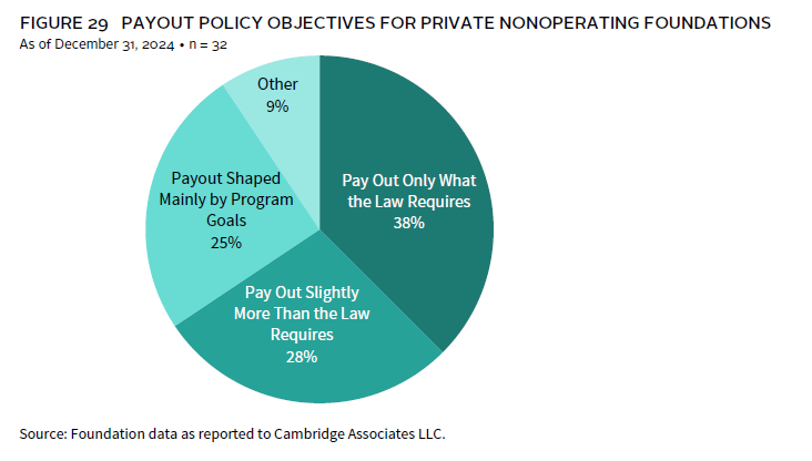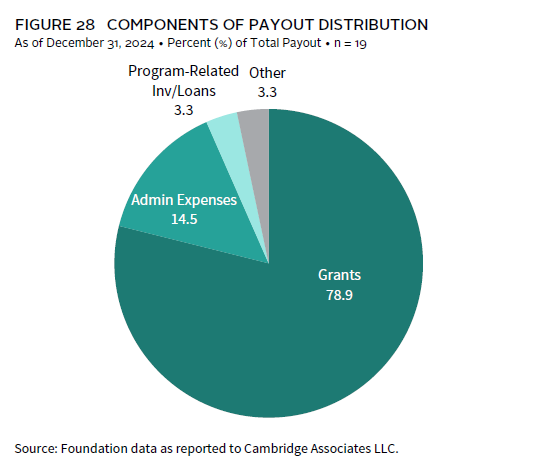 Grants are the single largest component of annual payout for foundations. On average, grants made up 79% of spending from the portfolio in 2024 (Figure 28). Administrative expenses were the next largest component of foundation spending, representing about 15% of total payout. The remaining portion of payout consists of program-related investments and other types of miscellaneous spending. This average breakdown is nearly identical to last year’s.