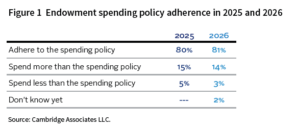 A table showing survey respondents' endowment spending policy adherence in 2025 and 2026. Of the respondents, 80% adhered to the spending policy in 2025, and 81% expect to adhere to the spending policy in 2026. 15% of respondents spent more than the spending policy in 2025, and 14% anticipate spending beyond policy, whereas 5% of respondents spent less than the spending policy in 2025, and 3% expect to spend less in 2026. Finally, 2% of the respondents are unsure of their spending policy adherence in 2026.