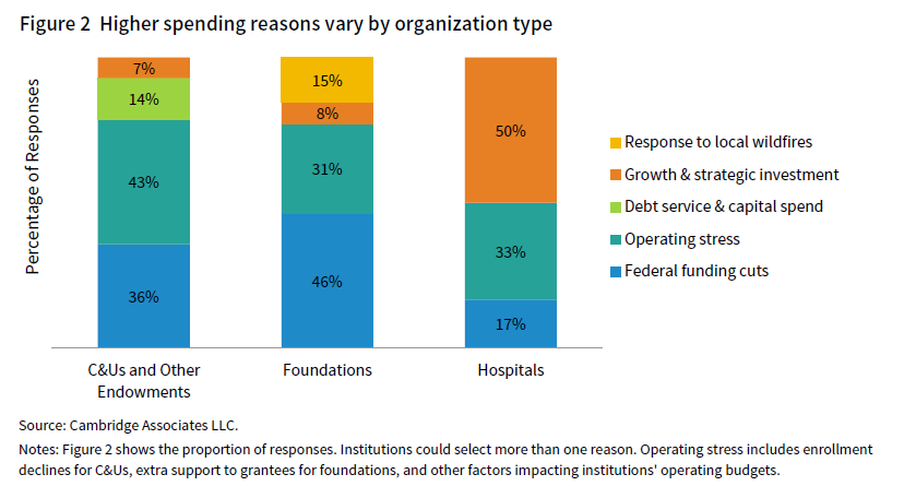 The institutions that expect to draw more from endowments (14%) cite that federal funding cuts and operating stress are driving most spending increases. Colleges and universities are spending more in response to financial stress that requires endowment funding to balance the operating budget. Several universities are taking additional endowment draws to fund capital projects or to pay debt service. Foundations are spending more than typical policy to replace some of the federal funding cuts. While a few hospitals are spending more because of operating stress and interruptions in government funding, more reported spending draws from their long-term investment portfolios (LTIP) to fund growth initiatives and investments in strategic plans.