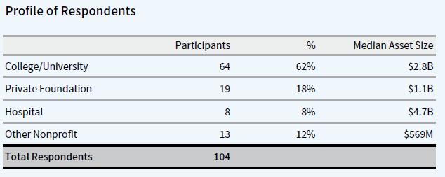 A table showing the profile of survey respondents. Of the 104 participants, the breakdown is 64 colleges/universities, 19 private foundations, 8 hospitals, and 13 other nonprofits.