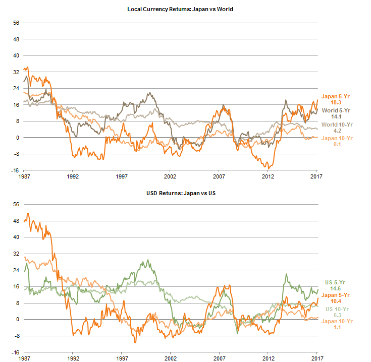 Japanese equities have had a strong run in recent years, returning 18.3% annualized over the five years to May 31, 2017—well above developed markets as a whole. Attractive starting valuations and earnings upside from a variety of cyclical and secular drivers boosted the asset class. Still, market turbulence along the way has challenged the conviction of many investors—a 21.2% drop during the first half of 2016 nearly derailed this streak. Yen depreciation has been a significant detractor for unhedged USD-based investors that were better off in US stocks over the past five years (Figure 1). Longer-term results have been lackluster and accompanied by significant volatility, explaining some of the investor ambivalence toward Japanese stocks. Despite more than doubling over the past five years (in yen terms), the asset class has returned less than 1% per annum over the past decade!