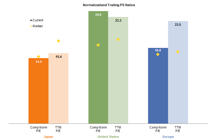 Notes: For all regions, median trailing 12-month (TTM) P/E ratios are calculated from January 31, 2002, to present. The normalized P/E for Japan (ROE-adjusted P/E) uses the same history. Normalized P/Es (composite normalized P/E) for US and Europe use the full history from December 31, 1969. The composite normalized P/E ratio is calculated by dividing the inflation-adjusted index price by the simple average of three normalized earnings metrics: ten-year average real earnings (i.e., Shiller earnings), trend-line earnings, and ROE-adjusted earnings. The ROE-adjusted P/E ratio multiplies the current trailing P/E multiple by the ratio of current ROE to historical ROE for each market.