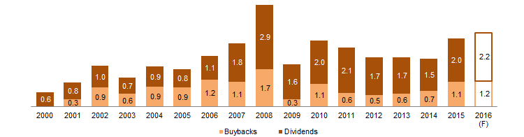 Figure 5. TOPIX Share Buybacks and Dividends as a Percentage of Market Value. Fiscal Years 2000–16 • Percent (%)