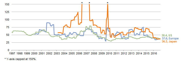 Figure 2. Comparing Japanese Equity Valuations to US and European Equities. As of May 31, 2017