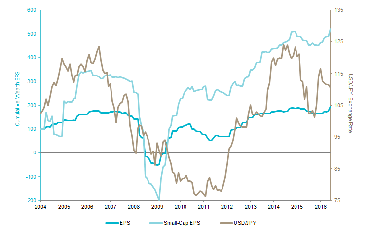 Looked at another way, small-cap earnings have displayed nearly the same trends as those of large caps (and in fact have seen a bigger resurgence) despite around 75% of their revenue coming from domestic sources. This also raises some questions over the dependence of profits on a weaker yen, and potentially speaks to the improvements in corporate governance.