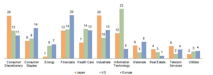 Note: Sector weights for Japan, Europe, and US are represented by the MSCI Japan Index, MSCI Europe Index, and MSCI US Index, respectively.