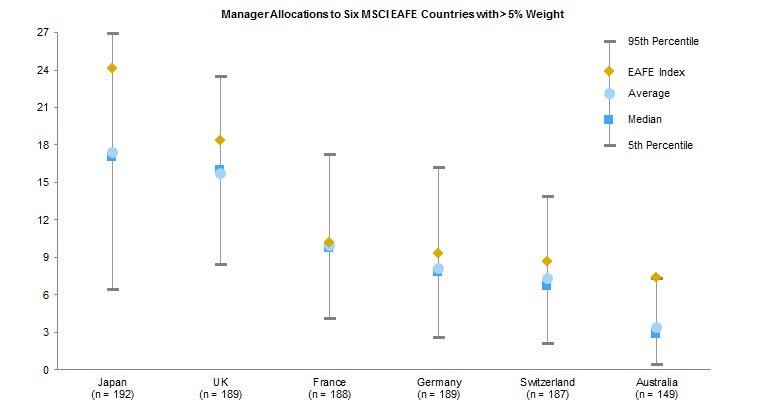 Figure 9. Global ex US Equity Managers’ Country Allocations vs the MSCI EAFE Index