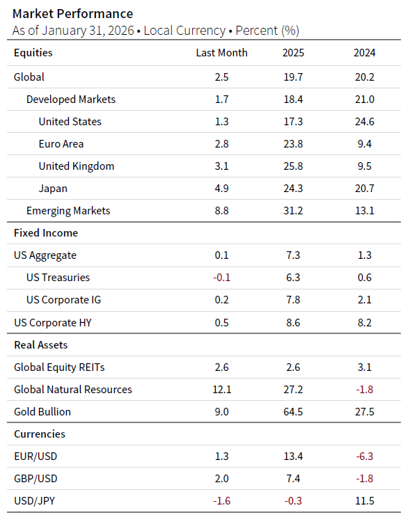 Notes: This edition was prepared on January 31, 2026, and it reviews developments of the prior month. The equity data are total returns net of dividend taxes of MSCI indexes in local currency. Global natural resources equities are represented by the MSCI All Country World Commodity Producers Index. The fixed income data are total returns for Bloomberg indexes. Gold Bullion uses near-month gold futures contracts, as traded on the COMEX, to determine performance. Currency performance is based on Reuters data.