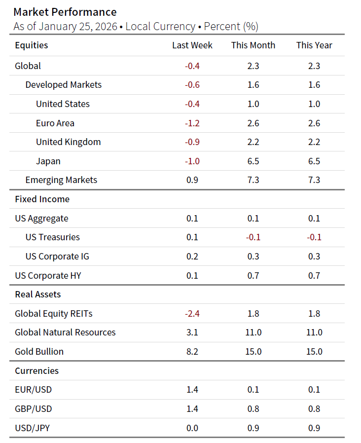 - Developed markets posted modest losses for the week as a series of headlines around Greenland drove sentiment. European and US stocks experienced some of the most notable roundtrips (down 2%–2.2% mid-week) as proposed trade tariffs were announced and then withdrawn. Evidence of US growth resilience—including an upward revision in GDP growth figures and a marginal increase in Q4 earnings expectations—aided the recovery.